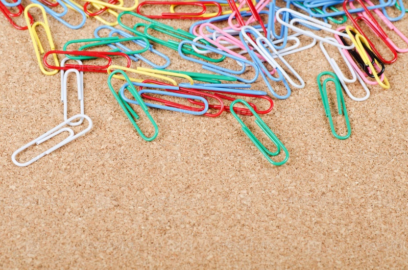 Разноцветные скрепки на коричневом фоне