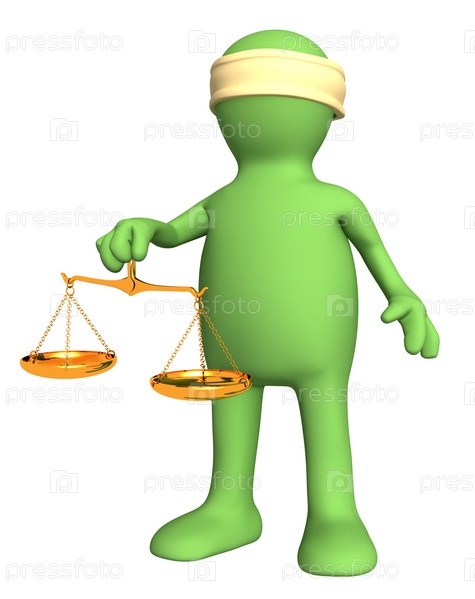 Стилизованный человечек с завязанными глазами, держащий в руке золотые весы