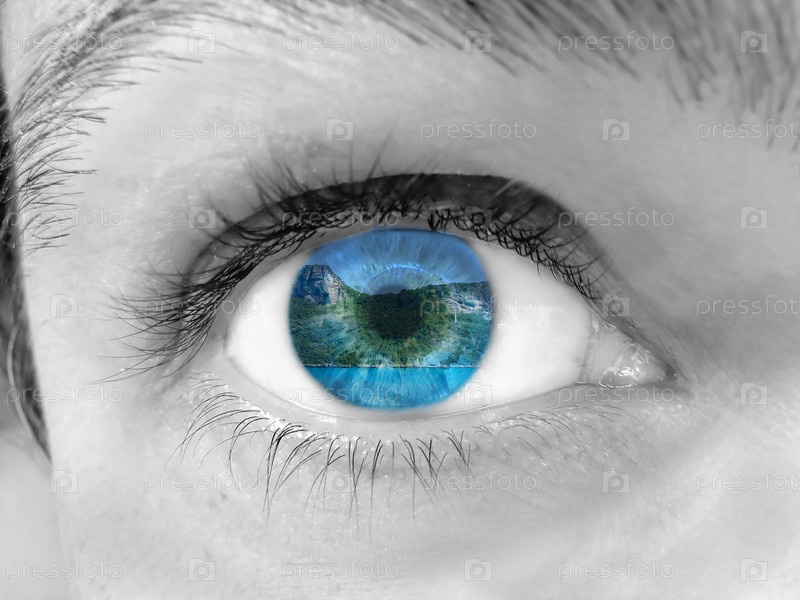 Крупным планом женский глаз с отражением морского пейзажа в зрачке