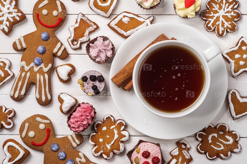 Черный чай с домашним печеньем и конфетами, вид сверху