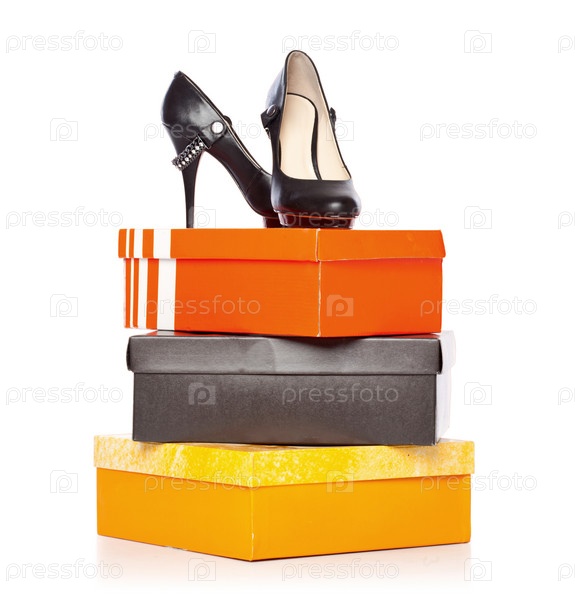 Черные женские туфли на коробках, белый фон