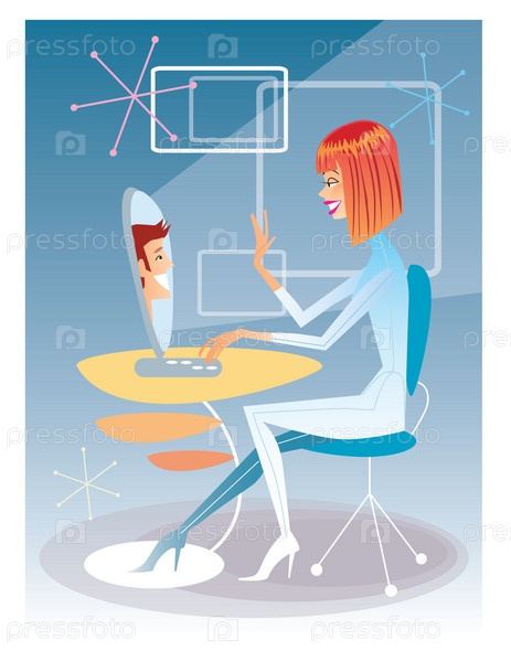 Молодая женщина говорит с компьютером