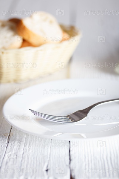 Пустая тарелка, вилка и корзинка с хлебом