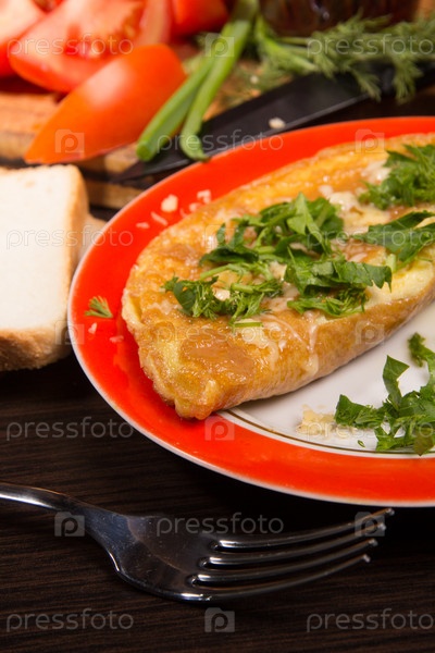 Омлет с сыром и свежей зеленью на столе