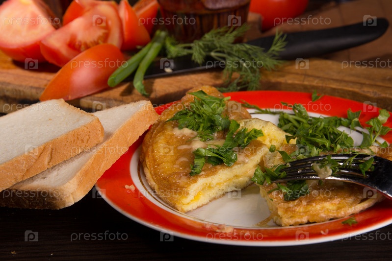 Омлет с сыром и свежей зеленью на столе
