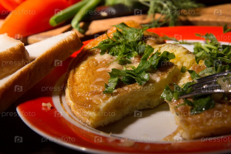 Омлет с сыром и свежей зеленью на столе