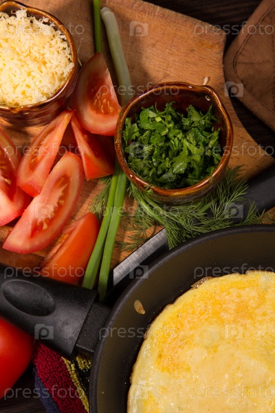 Омлет с сыром и свежей зеленью на столе