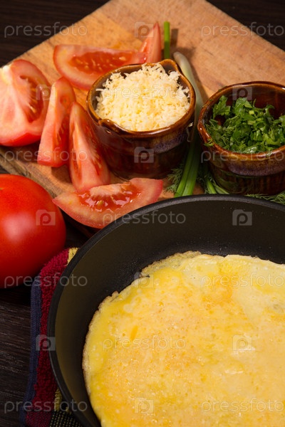Омлет с сыром и свежей зеленью на столе