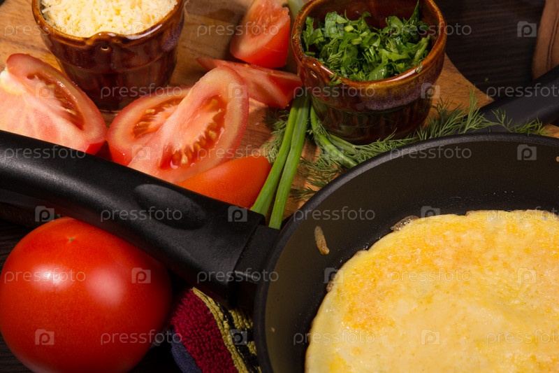 Омлет с сыром и свежей зеленью на столе