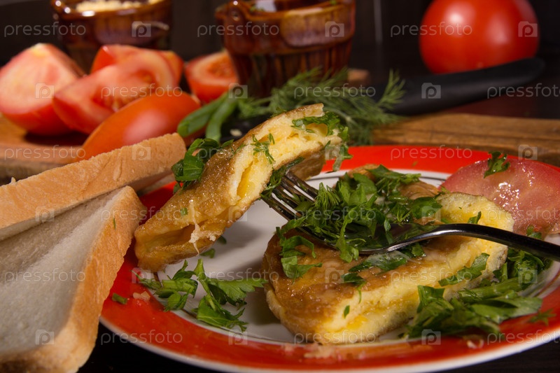 Омлет с сыром и свежей зеленью на столе