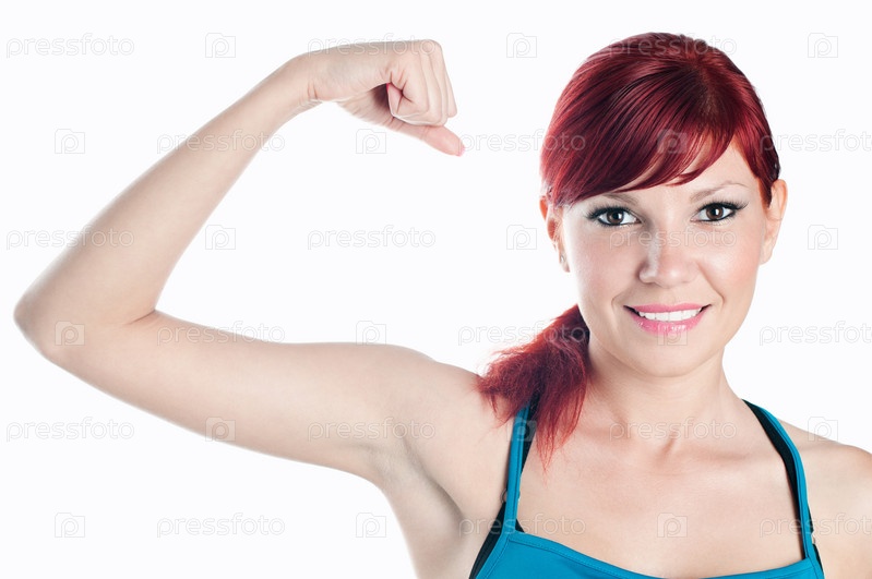 Спортивная девушка демонстрирует бицепс, изолированная на белом фоне