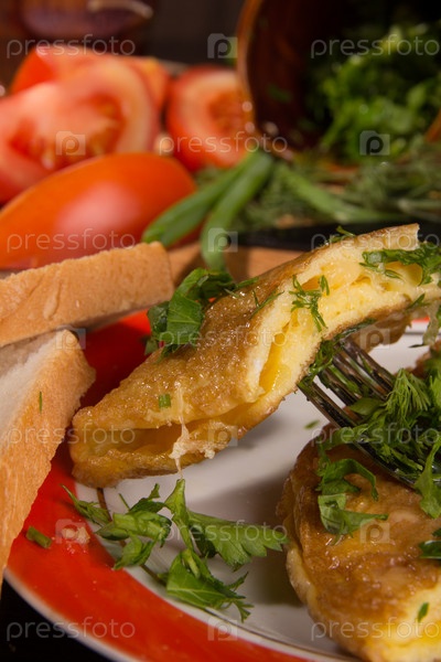 Омлет с сыром и свежей зеленью на столе