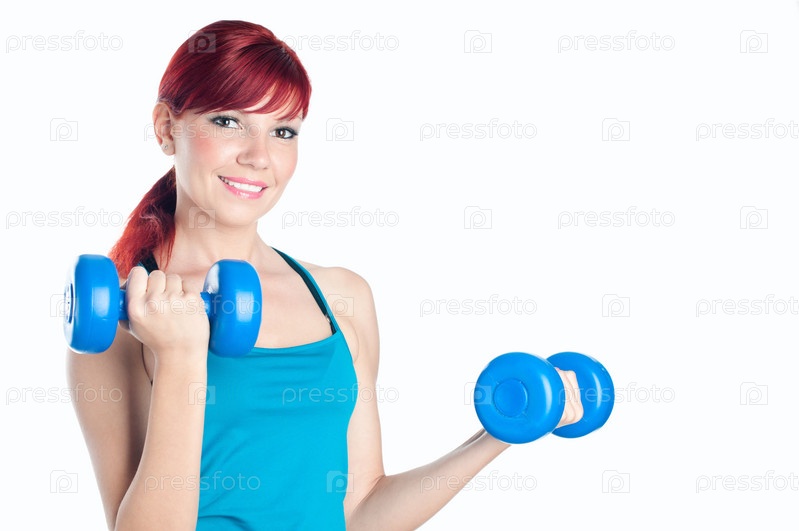 Спортивная молодая девушка, тренирующаяся с гантелями, на белом фоне
