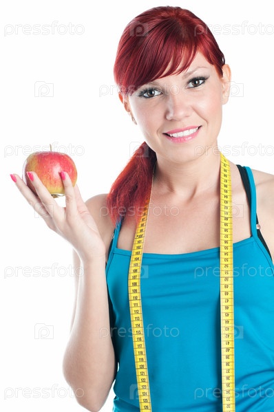 Счастливая спортивная девушка с яблоком и сантиметровой лентой, изолированная на белом фоне
