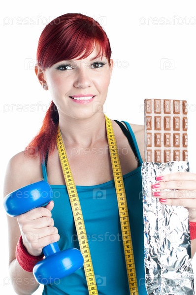 Молодая девушка с гантелей в одной руке и плиткой шоколада в другой. Спортивный образ жизни