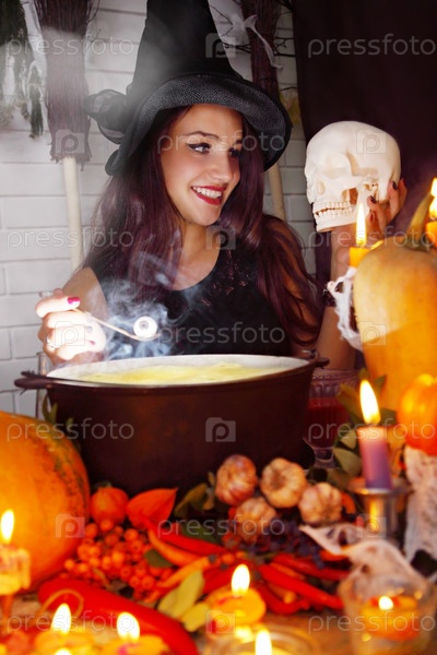 Красивая ведьма варит зелье в котле