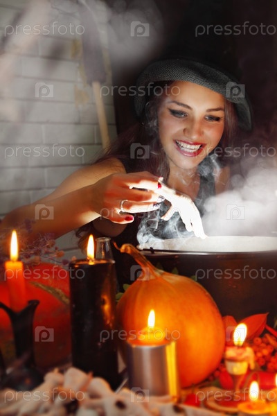 Красивая ведьма варит зелье в котле