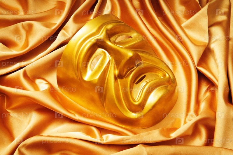 Золотая театральная маска на золотистой ткани