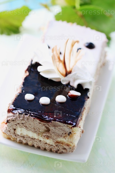 Кусок торта с кремом и шоколадной глазурью