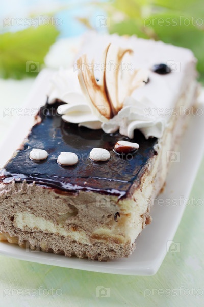 Кусок торта с кремом и шоколадной глазурью