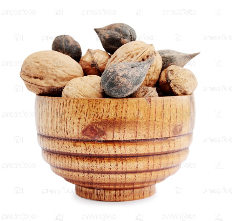 Орехи в деревянной миске, изолированные на белом фоне