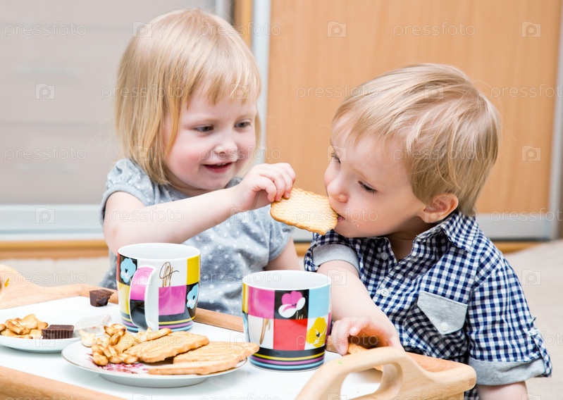 Маленькая девочка и мальчик едят печенье с чаем, сидя на полу за детским столиком