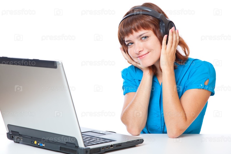 Девушка в наушниках сидит перед ноутбуком, на белом фоне