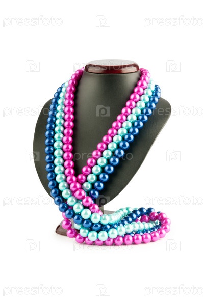 Розовые, синие и голубые бусы на манекене на белом фоне
