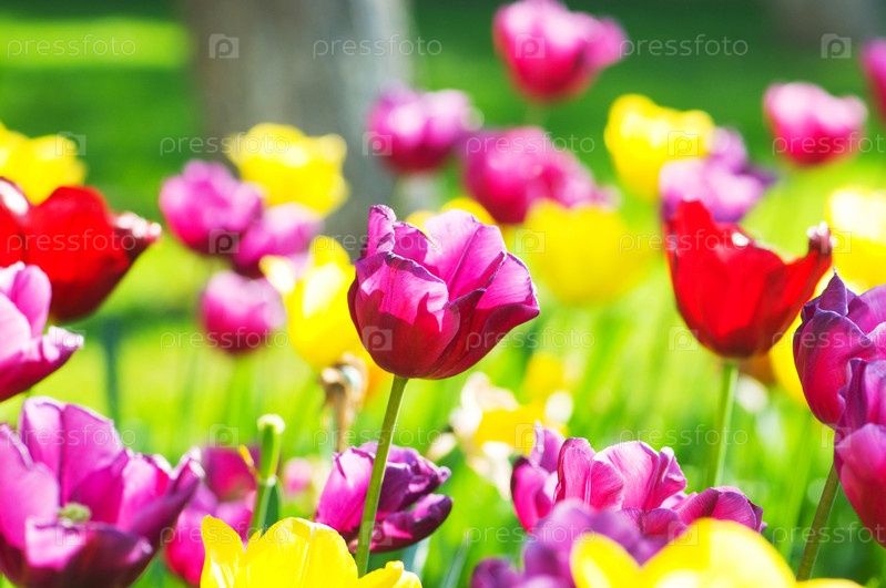 Разноцветные тюльпаны на клумбе