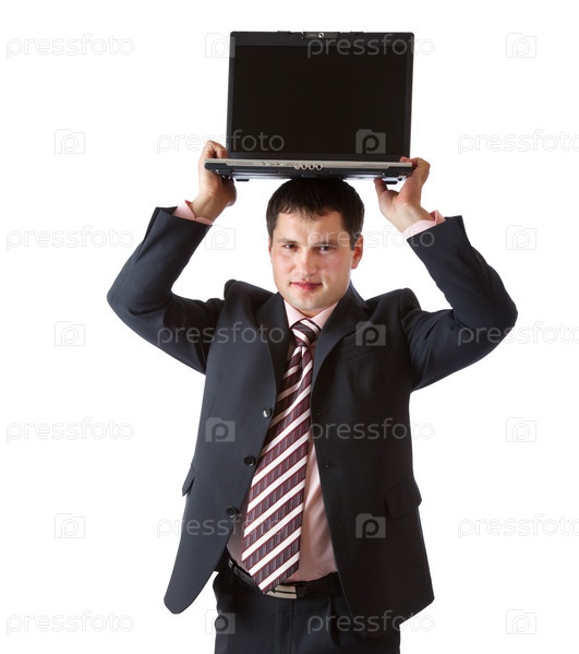 Бизнесмен держит ноутбук над головой на белом фоне
