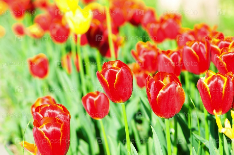Красные и желтые тюльпаны на клумбе