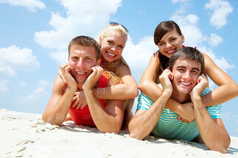 Веселые друзья лежат на пляже