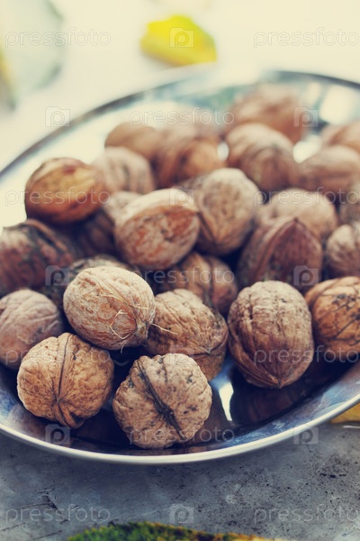 Грецкие орехи на металлической тарелке