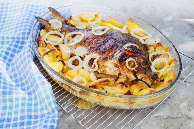 Запеченный карп с картофелем, луком и специями