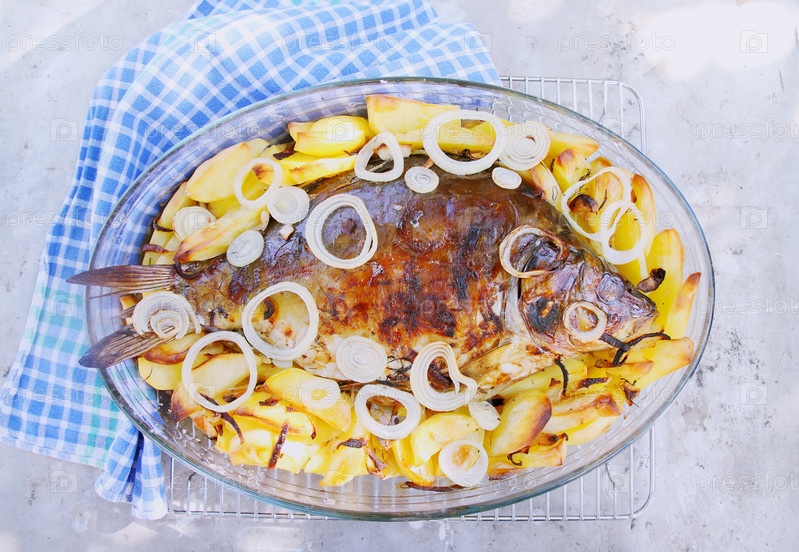 Запеченный карп с картофелем и луком