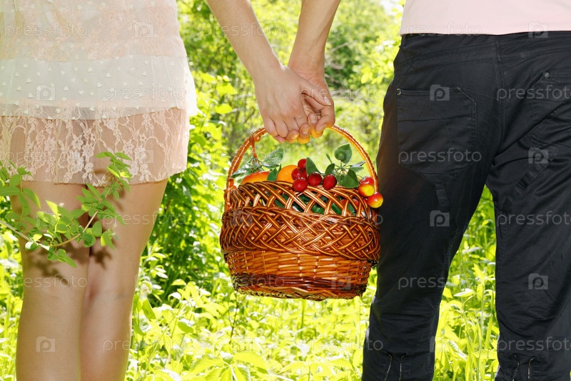 Молодая пара вместе несет корзину с фруктами