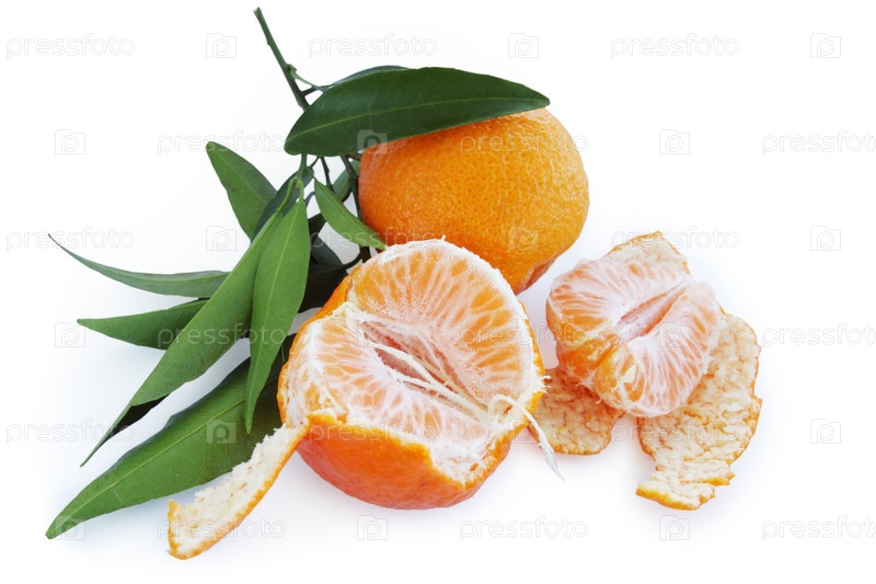 Мандариы с листьями, изолированные на белом фоне