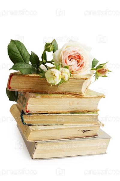 Старые книги и розы, изолированные на белом фоне