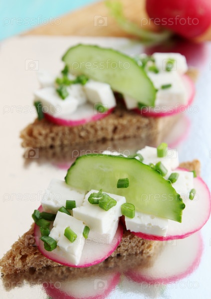 Канапе с сыром, огурцом, редисом и кинзой