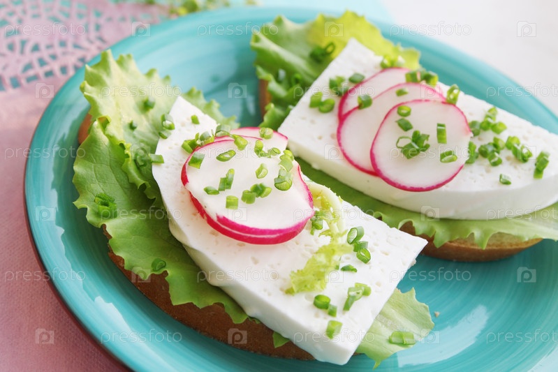 Сэндвич с сыром, редисом, луком и листьями салата