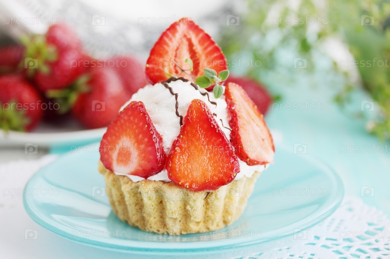 Кекс с кремом и свежей клубникой