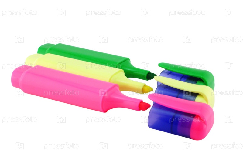 Три маркера разного цвета, изолированные на белом фоне