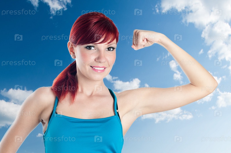 Спортивная девушка демонстрирует бицепс, на фоне неба