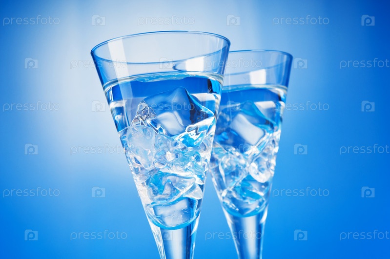 Вода со льдом в фужерах на синем фоне