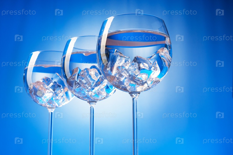 Вода со льдом в бокалах на синем фоне