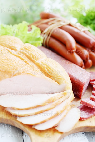 Копченая куриная грудинка, колбаса, сосиски