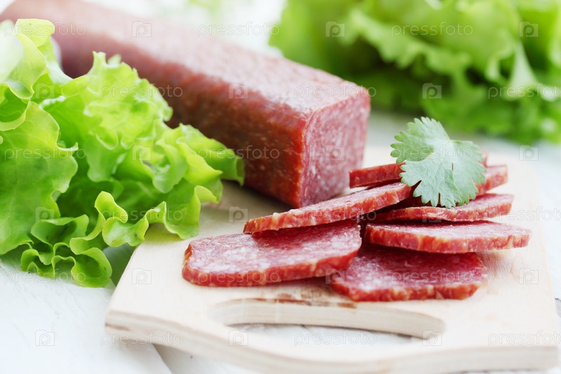 Нарезанная колбаса на доске