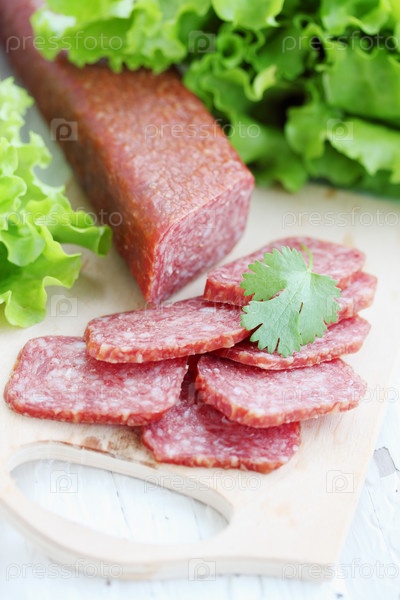 Нарезанная колбаса на доске