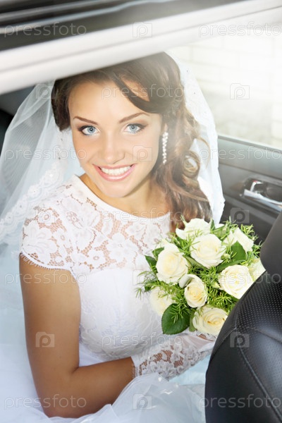 Невеста с букетом роз сидит в автомобиле