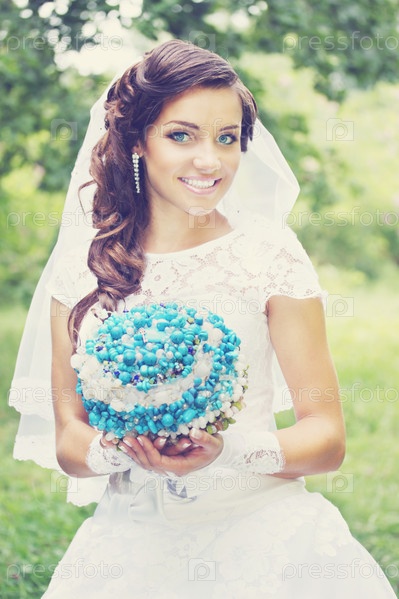 Красивая невеста с букетом из бирюзы